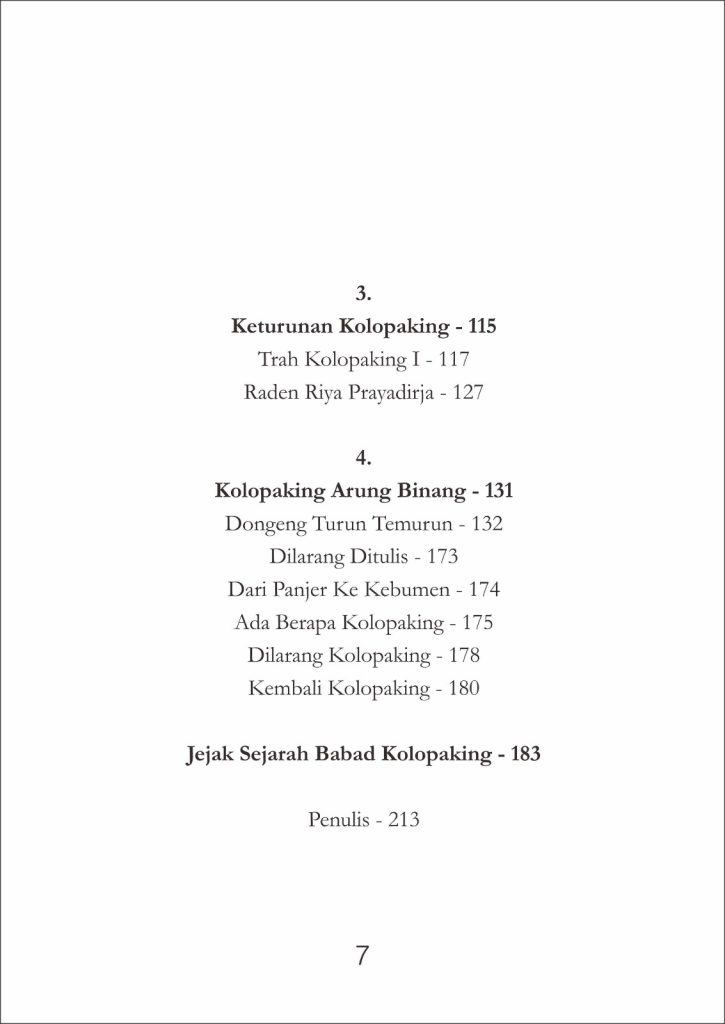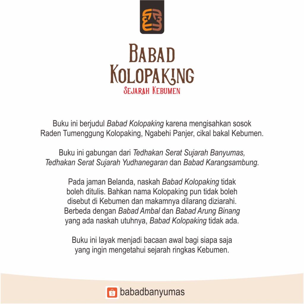 Buku ini berjudul Babad Kolopaking karena mengisahkan sosok Raden Tumenggung Kolopaking, Ngabehi Panjer, cikal bakal Kebumen.
